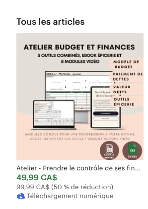1. Tu pourras ensuite accéder à ma boutique sur Etsy et tu verras le produit: Atelier – Prendre le contrôle de ses finances grâce au budget qui est présentement à 50% de rabais (49,99$ au lieu de 99,99$)