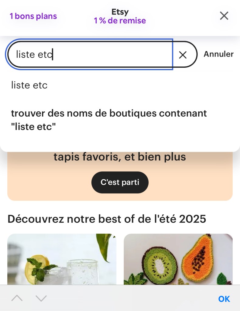 2. Dans la barre de recherche de Etsy, écris Liste Etc et choisis « Trouver des noms de boutiques contenant Liste Etc ».